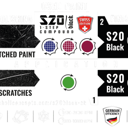 S20 Black Swiss Edition on uuenduslik ja ainulaadne üheastmeline kõrge jõudlusega poleerimisvahend, mis sobib laialdaseks kasutamiseks kõigi levinumate värvisüsteemide puhul. Selle ainulaadse koostise väljatöötamisel keskendusime pühkimise lihtsustamisele ja üheastmelise poleerimisvahendi täiuslikule kasutatavusele („EasyClean“-koostis).